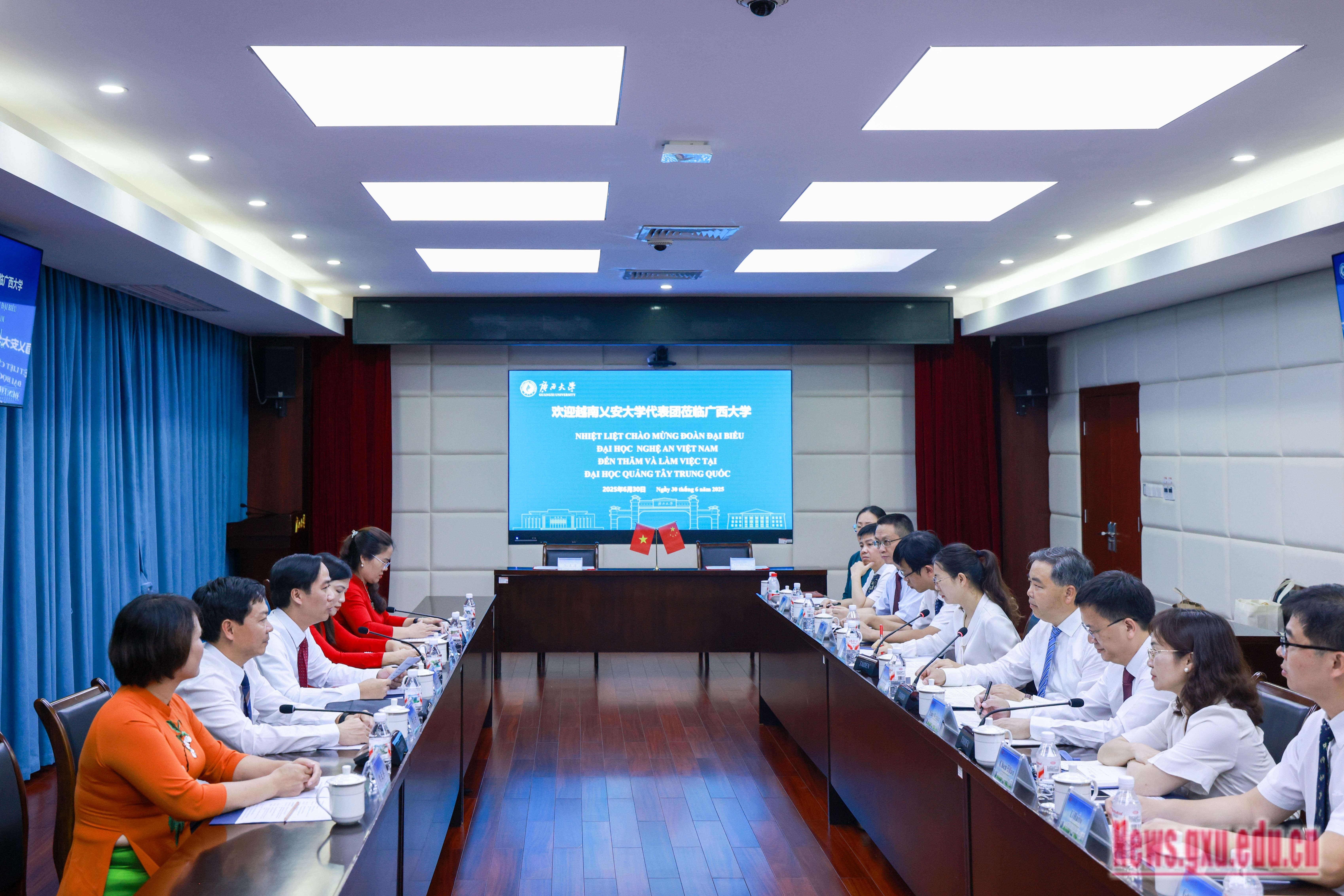 On June 30, 2025, President of NGHE AN University, Vietnam, Nguyen Ngoc Hieu led a delegation to Guangxi University. Li Guozhong, Secretary of the CPC GXU Committee, met with the guests. Xiao Jianzhuang, Vice President, presided over the symposium.Li Guozhong welcomed Nguyen Ngoc Hieu and his entourage. He said that this year marks the 75th anniversary of the establishment of diplomatic relat...