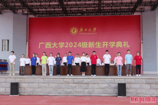 Các vị lãnh đạo và viện sĩ ngồi ở hàng ghế đầu đã trao tặng huy hiệu trường cho các đại diện tân sinh viên khóa 2024. Phó Bí thư Đảng ủy Nhà trường, Trưởng nhóm Kiểm tra Kỷ luật và Giám sát của Uỷ ban Kiểm tra Kỷ luật và Giám sát khu tự trị tại Đại học Quảng Tây, Bí thư Uỷ ban Kiểm tra Kỷ luật Nhà trường Kim Thuận Nam, Phó Hiệu trưởng Ninh Húc Sơ, Phùng Gia Huân, Hạ Quốc Ân, Tiêu Kiến Trang, Lương Ân Duy và một số người phụ trách chuyên ngành, chuyên gia và giáo sư nổi tiếng, người phụ trách chính của các học viện, bộ phận chức năng đã tham dự lễ khai giảng.