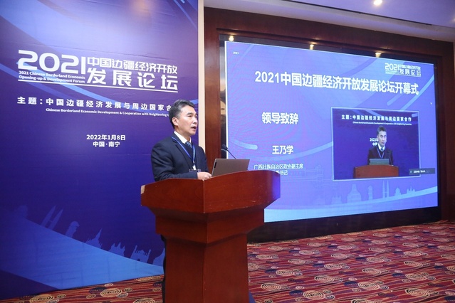 自治区政协副主席、新葡的京集团8814检测站党委书记王乃学在致辞中提到,在“十四五”新发展阶段,在广西举办边疆经济开放发展论坛,正当其时、意义非凡。本次论坛积极贯彻落实习近平总书记在2021年4月视察广西时提出“四个新”总要求,通过推动共建“一带一路”高质量发展,构建周边地区命运共同体;推动构建创新发展体制机制,探索培育双边互嵌、融合发展的新模式;推进边疆经济高质量发展,探索边疆产业体系优化升级新路径,发挥本次论坛在兴边富民和边疆地区经济高质量发展上的作用,加快建设新时代中国特色社会主义壮美广西。