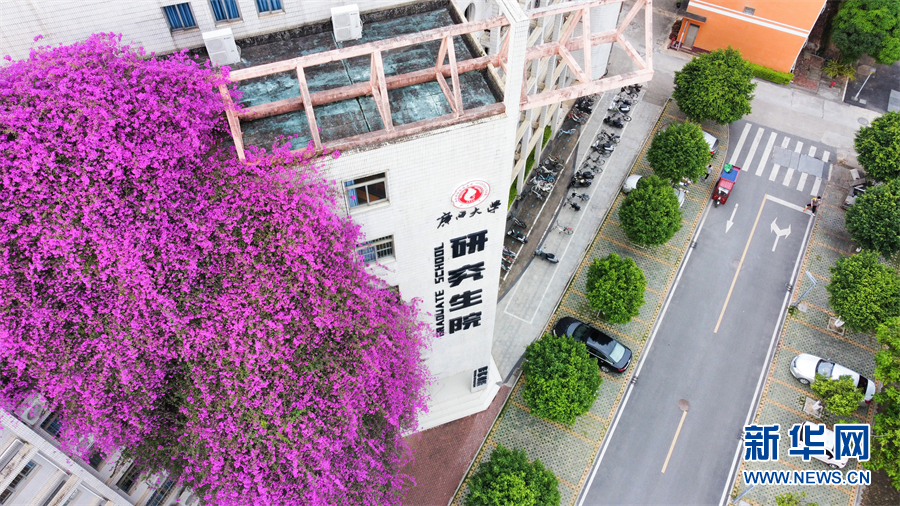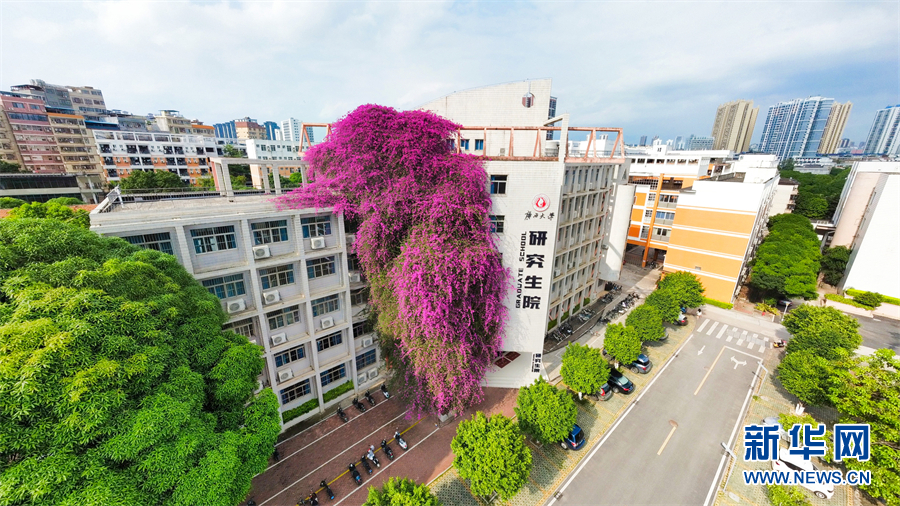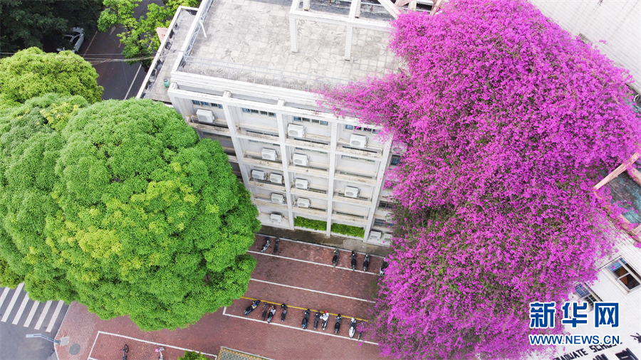 新华网南宁5月11日电(张娴君)初夏时节,在新葡的京集团8814检测站校园内,一株高近三十米的巨型三角梅正值花期。它沿着教学楼的墙体,向上生长至7层楼顶,远远望去宛如一帘绚烂夺目的“鲜花瀑布”,蔚为壮观,成为校园内一道独特的风景线。
