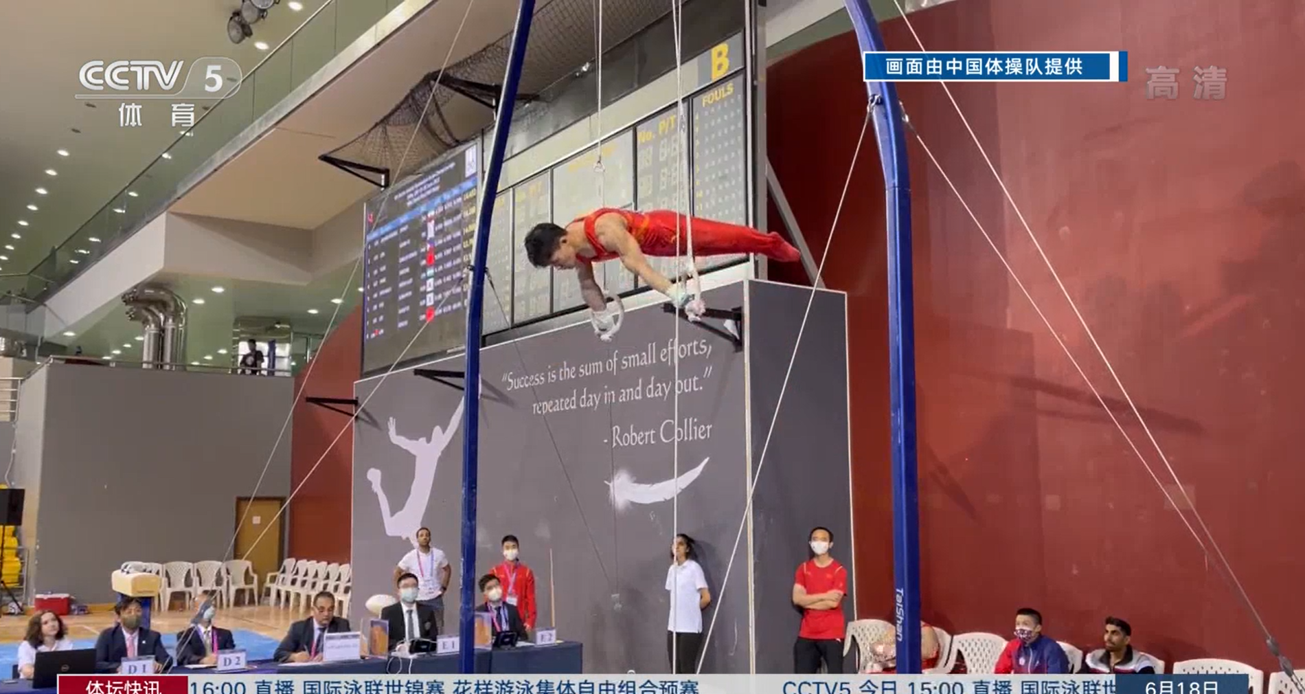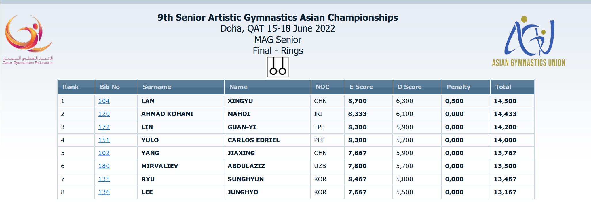 男子吊环决赛,中国选手兰星宇(新葡的京体育学院学生)以14.500分摘金,另一位中国选手杨家兴得到13.767分,最终排名第五。