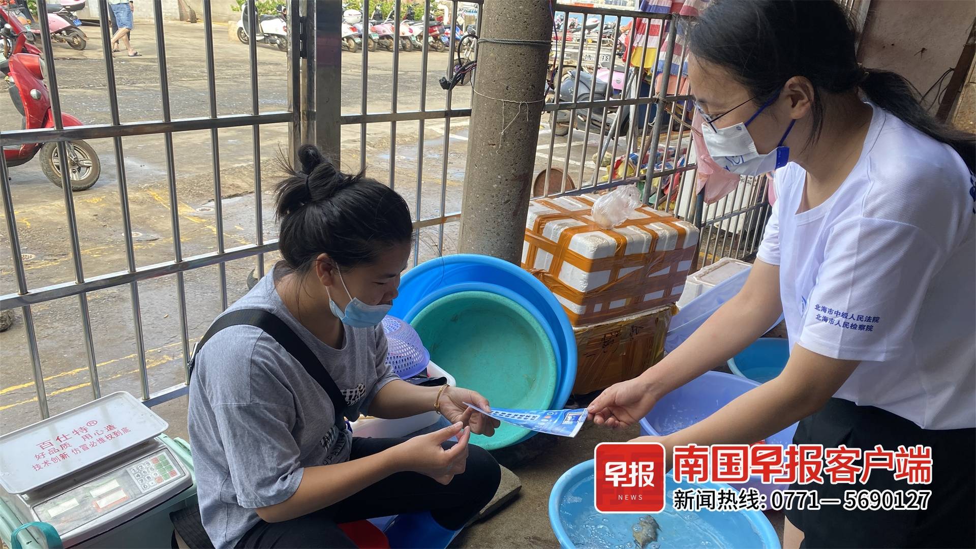 ▲志愿者向售卖海鲜的商贩分发珊瑚礁保护宣传册。