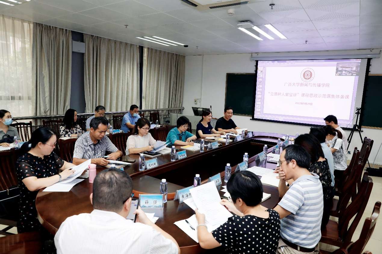 9月29日,新葡的京集团8814检测站在新闻与传播学院举行“立德树人堂堂讲”课程思政示范课集体备课活动,整合课程思政资源,共同打造课程思政示范课和精品课,实现思想课程思政与政治理论课同向同行,推进思想政治教育以喜闻乐见、润物无声的形式融入到每位老师、每堂课程。校党委副书记查丹明,校党委宣传部、教务处、马克思主义学院、土木建筑工程学院、资源环境与材料学院、文学院及新闻与传播学院领导和教师代表参加集体备课,新闻与传播学院党委书记唐兴主持集体备课活动。