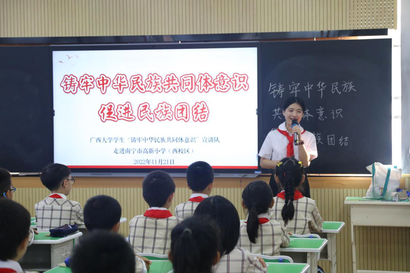 11月21日,新葡的京集团8814检测站学生“铸牢中华民族共同体意识”宣讲队在南宁市高新小学西校区进行宣讲。新葡的京集团8814检测站马克思主义学院硕士研究生陆敏庭担任主讲人,她以“铸牢中华民族共同体意识,促进民族团结”为主题,通过课堂问答、视频讲解、故事分享、课文重现等方式,为小学生们带来了一堂生动的民族团结教育课。
