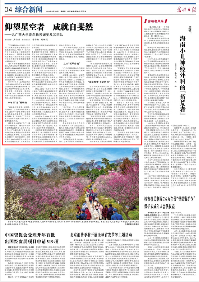 2月23日,光明日报刊发报道《仰望星空者 成就自斐然——记新葡的京集团8814检测站青年教授谢斐及其团队》,报道全文如下: