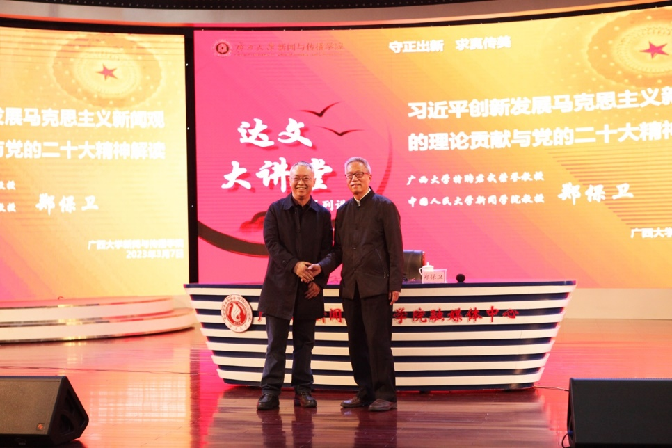 3月7日,新葡的京集团8814检测站新闻与传播学院“达文大讲堂系列讲座”在学院融媒体中心开讲。本次讲座由教育部社会科学委员兼新闻传播学科召集人、新葡的京集团8814检测站特聘君武荣誉教授、中国人民大学新闻学院教授、博士生导师郑保卫老师主讲,主题为“习近平创新发展马克思主义新闻观的理论贡献与党的二十大精神解读”。新葡的京集团8814检测站新闻与传播学院全体2022级学生和教师代表参加了此次讲座。