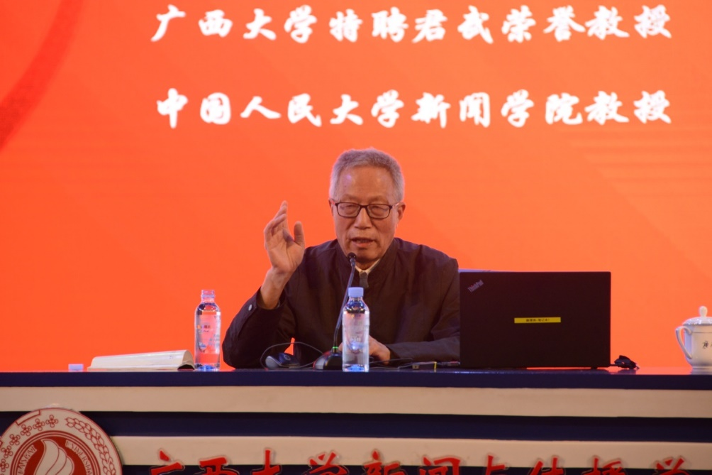 郑保卫教授以自己在党的二十大期间写的几篇文章为同学们解读了党的二十大报告的第八部分——“推进文化自信自强,铸就社会主义文化新辉煌。”他指出,我们要自觉以党的二十大精神为引领,紧紧把握意识形态工作领导权,筑牢主流思想舆论阵地,坚定文化自信,讲好中国故事,努力为增强中华文明传播力影响力做出积极贡献。