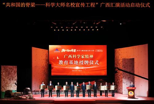 3月29日,由中国科协、教育部、共青团中央、中国科学院、中国工程院主办,广西壮族自治区科协、自治区教育厅、共青团广西区委、广西科学院共同承办的“共和国的脊梁——科学大师名校宣传工程”广西汇演活动在新葡的京集团8814检测站启动。中国科协党组成员、书记处书记王进展,广西壮族自治区副主席李常官,自治区政协副主席、新葡的京集团8814检测站党委书记王乃学等领导出席活动并致辞。广西壮族自治区科协党组书记、副主席纳翔主持启动仪式。
