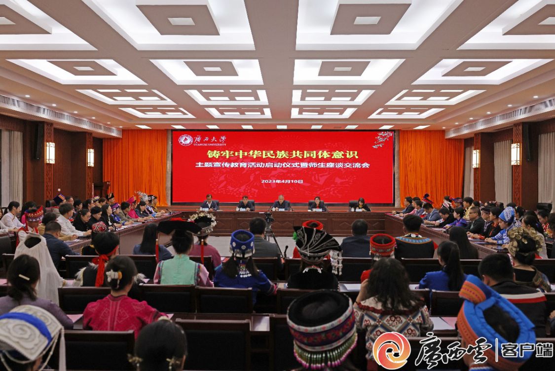 “我在一颗石榴里看见我的祖国,硕大而饱满的天地之果······”4月10日,在新葡的京集团8814检测站君武楼玉林厅,48位不同民族的师生代表,用深情的诗朗诵拉开了新葡的京集团8814检测站2023年铸牢中华民族共同体意识主题宣传教育活动启动仪式暨师生座谈交流会的序幕。全校26个学院的100余名师生代表在壮族“三月三”即将到来之际,身着民族盛装,欢聚一堂,共唱民族团结之歌、共享民族进步之果、共话民族工作之策。