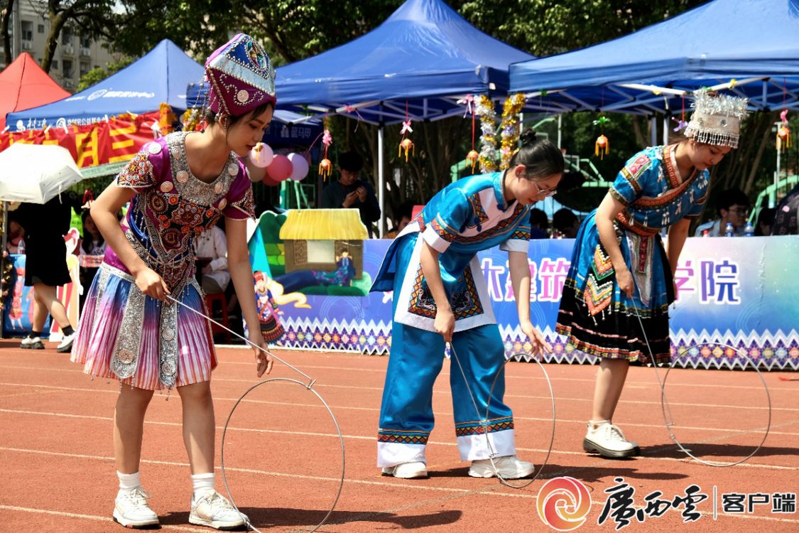 抢糍粑、高脚马、抛绣球、射箭、打陀螺、壮语传话筒……师生们在活动现场亲身体验了一把少数民族传统竞技项目,组队比拼、热火朝天,呐喊助威声响彻校园;而在民族文化体验区,师生们不仅参观了民族饰品展和民族文化长廊,更是抓住机会穿着少数民族服饰拍照打卡,感受民族文化的独特魅力;此外,在参与丰富多彩的游戏过程中,师生们还赢得了精美的民族特色礼品,校园里一片欢声笑语、其乐融融。