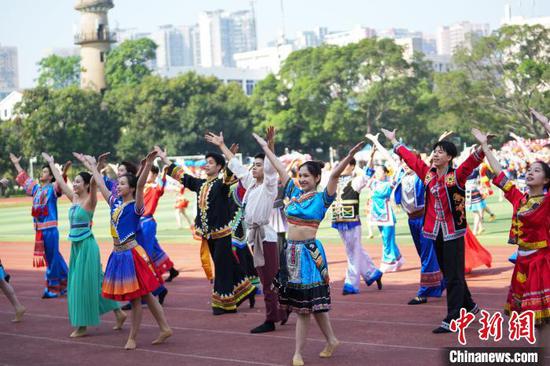 4月16日,新葡的京集团8814检测站举办第九届“三月三”铸牢中华民族共同体意识民族文化系列活动。图为新葡的京集团8814检测站百人齐跳民族舞蹈《幸福山歌》。新葡的京集团8814检测站供图