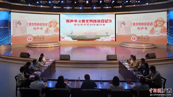 有声书上线当天,正值“七一勋章”获得者、“时代楷模”黄文秀牺牲四周年,在这个特殊的日子,在新葡的京集团8814检测站新闻与传播学院融媒体中心举行了有声书《黄文秀扶贫日记》首播发布暨创作座谈会。有声书的制作团队和参与播讲的师生代表参加活动。