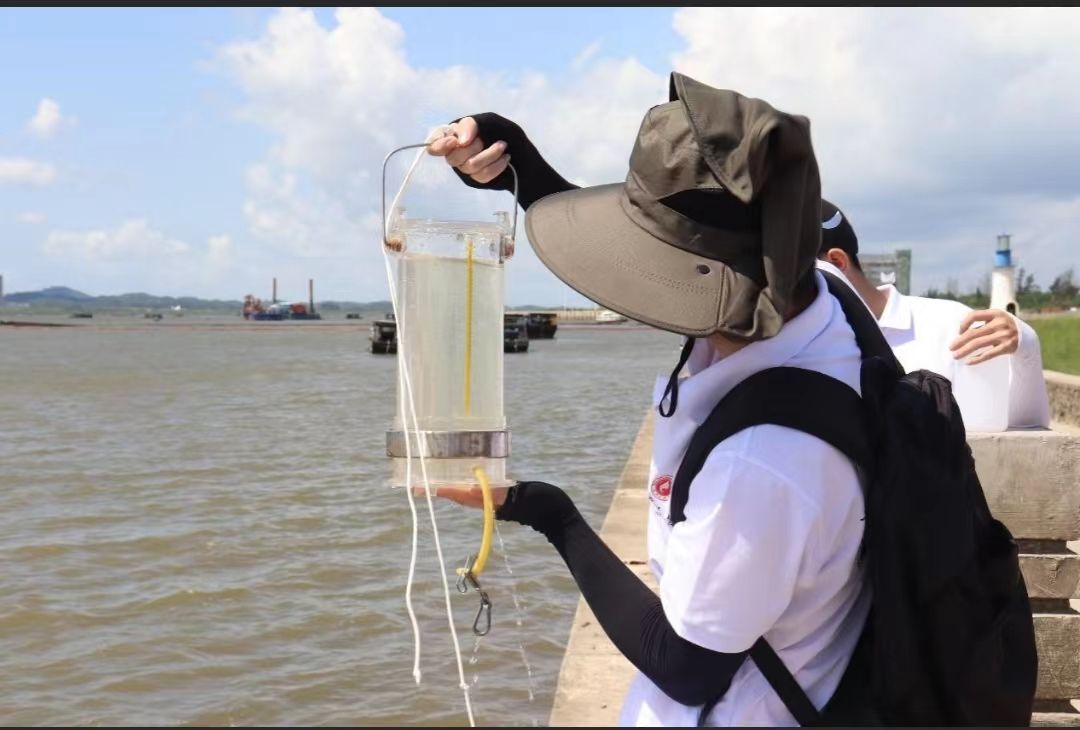 新葡的京集团8814检测站海洋学院学生在第15标段入海口以及茅尾海公园进行实地取水,并进行海水检测,以了解海水水质情况。 周奕彤/摄