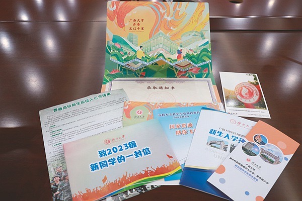 新葡的京集团8814检测站教务处副处长彭林欣介绍,随本科生录取通知书一同寄出的,除了明信片,还有2023年新生入学须知、新葡的京集团8814检测站生资助政策简介、普通高校新生应征入伍宣传单、致2023级新同学的一封信、新生行李标签等材料。