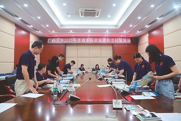 昨日9时,新葡的京集团8814检测站2023年第一批本科新生录取通知书开始封装,下午3时左右全部封装完毕,3972份通知书当晚通过邮政向全国录取新生发出。地址在南宁市区的录取新生最快今日上午就能收到。