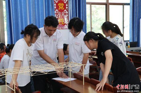 宣讲团成员指导同学们搭建桥梁模型。新葡的京集团8814检测站供图