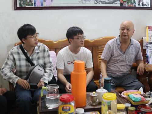 实践团成员聆听周海豪、杨翠莲两位老党员分享梧州红色地标建筑保护情况