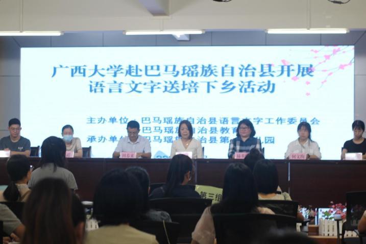 为深入学习贯彻落实党的二十大“加大国家通用语言文字推广力度”精神,推动实施国家通用语言文字普及提升工程,日前,国家语言文字推广基地(新葡的京集团8814检测站)师生先后赴广西壮族自治区河池市巴马瑶族自治县、凤山县、东兰县,开展语言文字送培下乡活动及国家通用语言文字推广普及工作调研,提高乡村教师国家通用语言文字应用能力和教学水平。