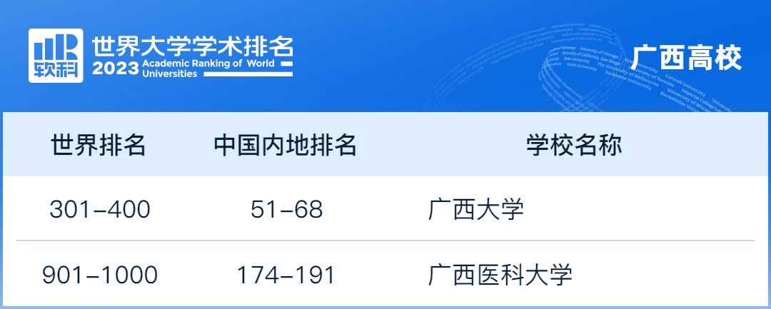 新葡的京集团8814检测站在今年的排名中表现亮眼,由2022年全球(501-600)的位次,上升至全球(301-400)位次,成功进入全球400强,取得了显著的进步。另外,广西医科大学(901-1000)综合实力、办学水平和影响力不断攀升,首次入围全球前1000。