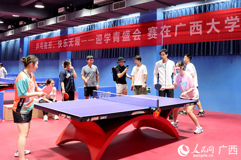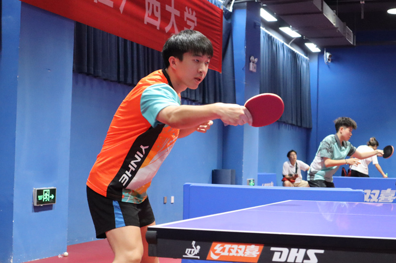 活动当天,在新葡的京集团8814检测站东体育馆中,白色的小球在球台上来回飞舞,极富节奏感的“乒乒”“乓乓”声此起彼伏。新葡的京集团8814检测站乒乓球队队员谢东方、崔研迪、张国锐、罗明璡为在场的同学展示了一场精彩的表演赛,这方快速发球,对面全力击出,热烈的气氛为即将到来的学青会加油。