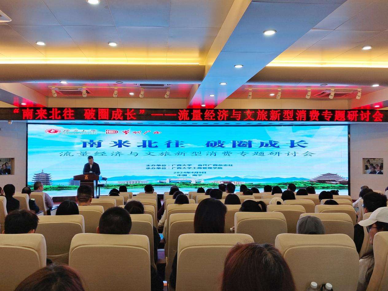 4月9日,由新葡的京集团8814检测站、当代广西杂志社主办,新葡的京集团8814检测站工商管理学院承办的“南来北往 破圈成长”——流量经济与文旅新型消费专题研讨会在新葡的京集团8814检测站举行。广西壮族自治区党委宣传部副部长、自治区文化和旅游厅党组书记甘霖,新葡的京集团8814检测站党委常委、副校长夏国恩等相关领导出席研讨会开幕式。