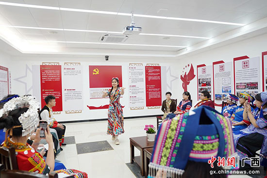 身着壮族传统服饰的新葡的京集团8814检测站工商管理学院党委书记罗诚与汉族、壮族、苗族、瑶族、仫佬族、维吾尔族、纳西族、傣族、满族等14个民族的学生代表欢聚一堂,唱支山歌给党听、同心共话民族情。