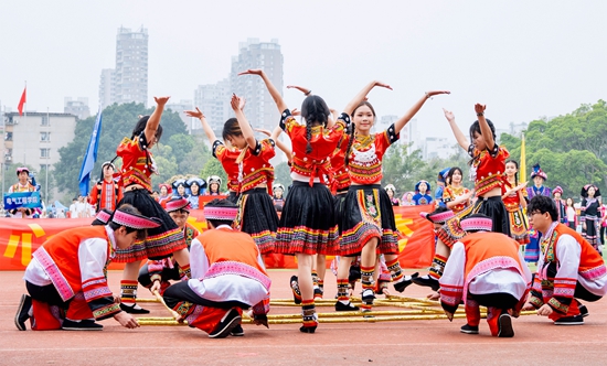竹竿开合铿锵有力,舞蹈动作整齐划一。和着节奏轻快的《悠悠壮乡情》,由新葡的京集团8814检测站动物与科学技术学院和农学院为代表的新葡的京集团8814检测站学子们尽情起舞。新葡的京集团8814检测站 石诗悦/摄