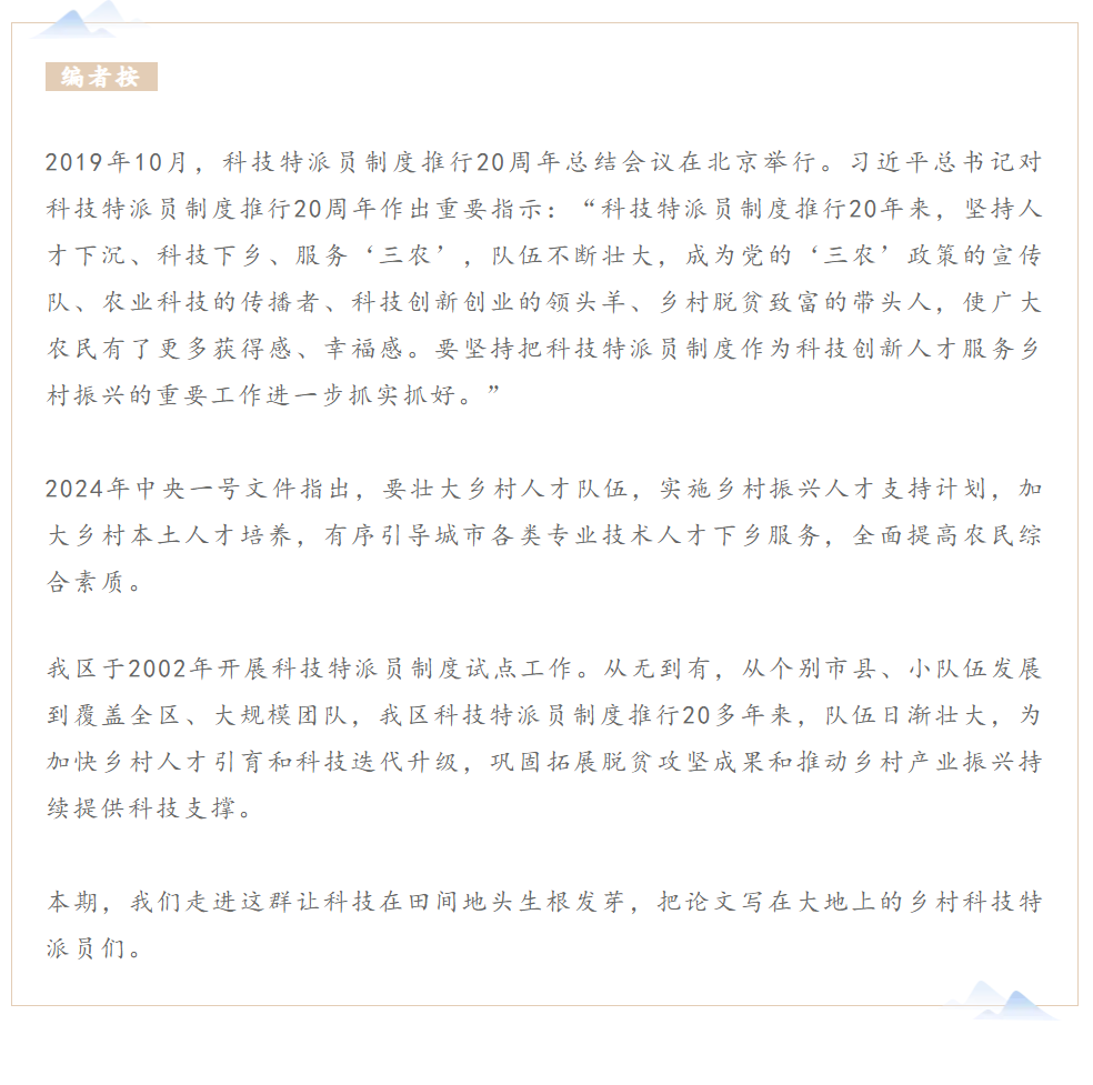 接下来,广西将抓住科技特派员的“科技”根本属性,持续拓展“特”的内涵,深度优化“派”的方式方向,有效扩大“员”的来源路径,创新释放“制度”的活力,推动广大科技特派员把科研论文写在大地上、把成效体现在推动农业发展和农民增收上,打通农业科技成果转化的“最后一公里”,力争形成科技兴农、人才强农的赋能效应、聚变效应、红利效应,为推动广西农业农村现代化作出特有贡献。