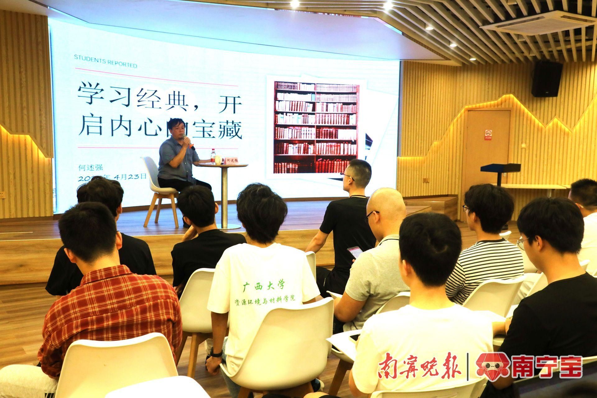 “我今天的讲座,就是希望大家适当告别手机。每天都留出一点时间,让心灵安静下来。放下手机,捧起经典,经典阅读实际上是让我们的生命变得丰富的最有效的途径。”4月23日为世界读书日,当天在新葡的京集团8814检测站图书馆举办的崇文大讲坛活动中,散文家何述强在与读者分享《学习经典 开启内心的宝藏》时提出了自己的希望。