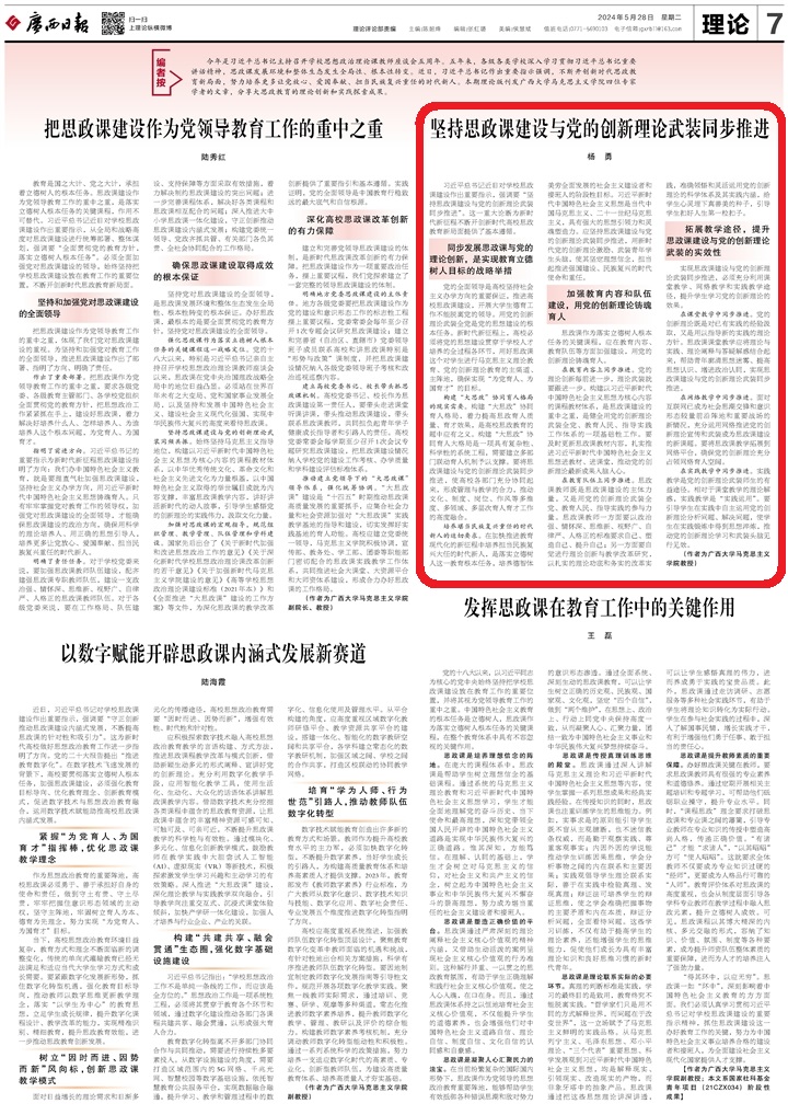 今年是习近平总书记主持召开学校思想政治理论课教师座谈会五周年。五年来,各级各类学校深入学习贯彻习近平总书记重要讲话精神,思政课发展环境和整体生态发生全局性、根本性转变。近日,习近平总书记作出重要指示强调,不断开创新时代思政教育新局面,努力培养更多让党放心、爱国奉献、担当民族复兴重任的时代新人。本期理论版刊发新葡的京集团8814检测站马克思主义学院四位专家学者的文章,分享大思政教育的理论创新和实践探索成果。