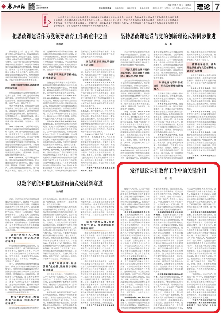 今年是习近平总书记主持召开学校思想政治理论课教师座谈会五周年。五年来,各级各类学校深入学习贯彻习近平总书记重要讲话精神,思政课发展环境和整体生态发生全局性、根本性转变。近日,习近平总书记作出重要指示强调,不断开创新时代思政教育新局面,努力培养更多让党放心、爱国奉献、担当民族复兴重任的时代新人。本期理论版刊发新葡的京集团8814检测站马克思主义学院四位专家学者的文章,分享大思政教育的理论创新和实践探索成果。