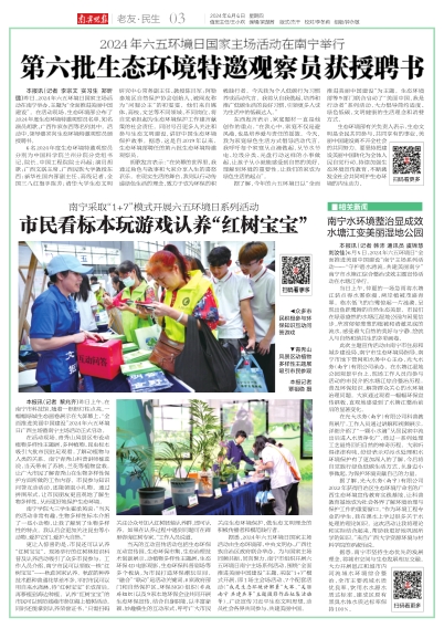 6月5日,2024年六五环境日“全面推进美丽中国建设”南宁主场系列活动——“守护碧水清流,共建美丽南宁”南宁市水塘江综合整治成效主题宣传活动在水塘江举行。