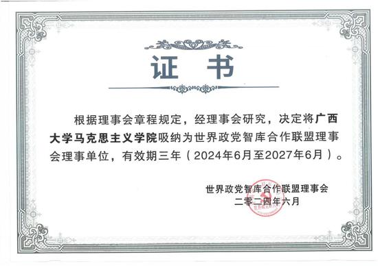 世界政党智库合作联盟理事单位证书。新葡的京集团8814检测站马克思主义学院供图