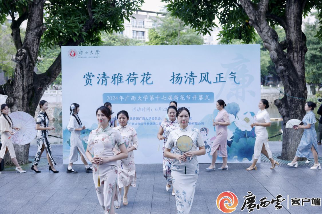 现场,歌舞《荷塘月色》、荷花主题国风旗袍走秀、“荷花仙子”湖面巡游等精彩节目引得路人纷纷驻足欣赏,荷花主题摄影及书画作品展、荷花DIY油画和漆扇体验等系列活动更是吸引了众多师生前来打卡。大家纷纷在廉洁主题横幅和倡议书上签名,表达自己弘扬敬廉崇洁优良传统、增强廉洁自律意识、培养学术自律精神、建设清廉新葡的京的决心。