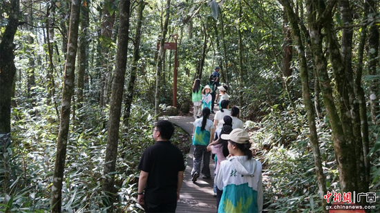 实践团成员在大明山丛林中寻找濒危野生植物。蒙玥盈 摄