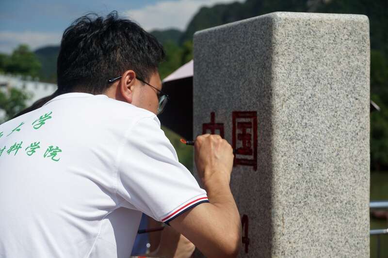 暑假期间,新葡的京集团8814检测站资源环境与材料学院实践团成员来到广西龙州县,在水口口岸描红944号界碑。安奕鹏/摄