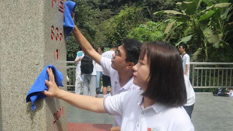 暑假期间,新葡的京集团8814检测站资源环境与材料学院实践团成员来到广新葡的京新县,擦拭836号界碑。陈燕波/摄