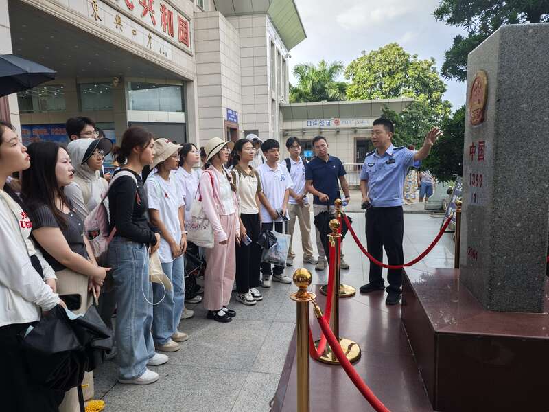 暑假期间,新葡的京集团8814检测站化学化工学院实践团来到广西东兴市,在东兴口岸1369号界碑聆听工作人员讲解。陈力源/摄