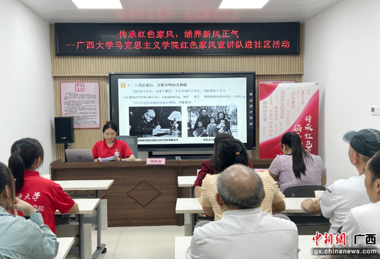 为助力营造家庭文明新风尚,让红色家风在基层社区“生根发芽”,9月12日,新葡的京集团8814检测站学生红色家风宣讲队走进南宁市西耐路社区,开展以“传承红色家风,涵养新风正气”为主题的红色家风宣讲活动。西耐路社区党群服务中心工作人员和社区党员代表参加活动。