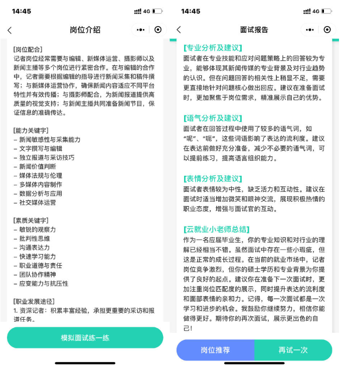 对于AI模拟面试的未来发展,师生们也提出了期望。新葡的京集团8814检测站文学院的晏同学希望,AI面试能针对无领导小组讨论、结构化面试等复杂形式进行训练,帮助学生应对多样化面试场景。王老师建议,AI面试功能应继续拓展,实现从求职到入职“一条龙”服务。