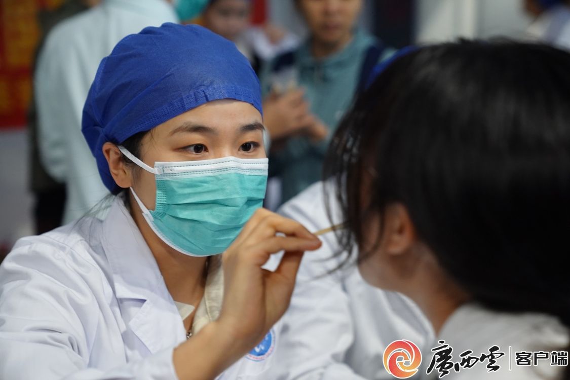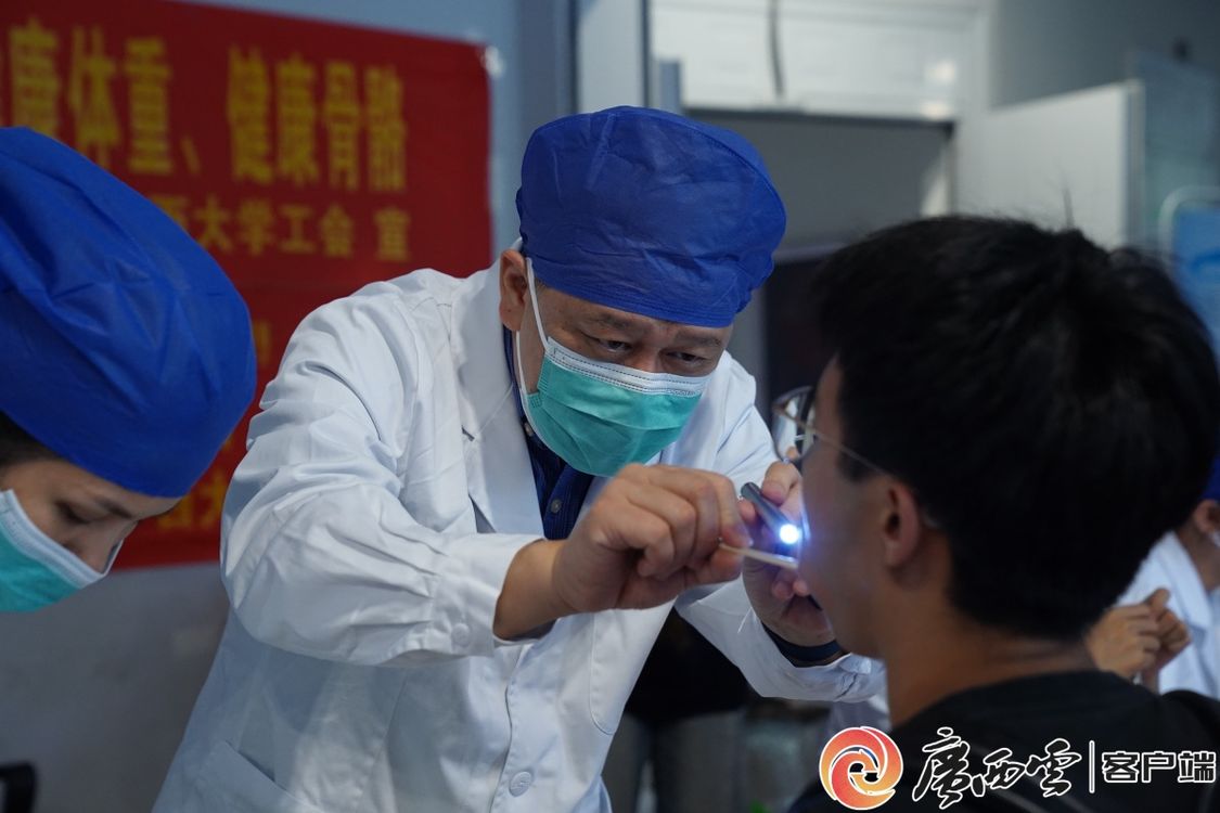 广西医科大学附属口腔医院院长廖红兵给新葡的京集团8814检测站师生进行口腔检查。