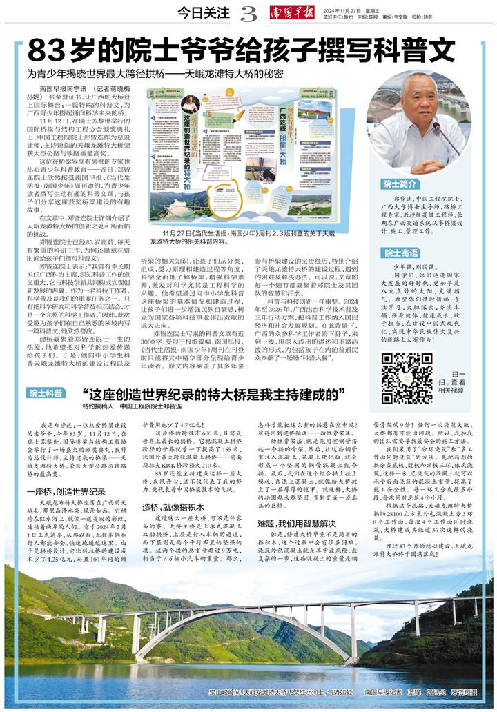 这位在桥梁界享有盛誉的专家也热心青少年科普教育——近日,郑皆连院士欣然接受南国早报、《当代生活报·南国少年》周刊邀约,为青少年读者撰写生动有趣的科普文章,与孩子们分享这座获奖桥梁建设的有趣故事。