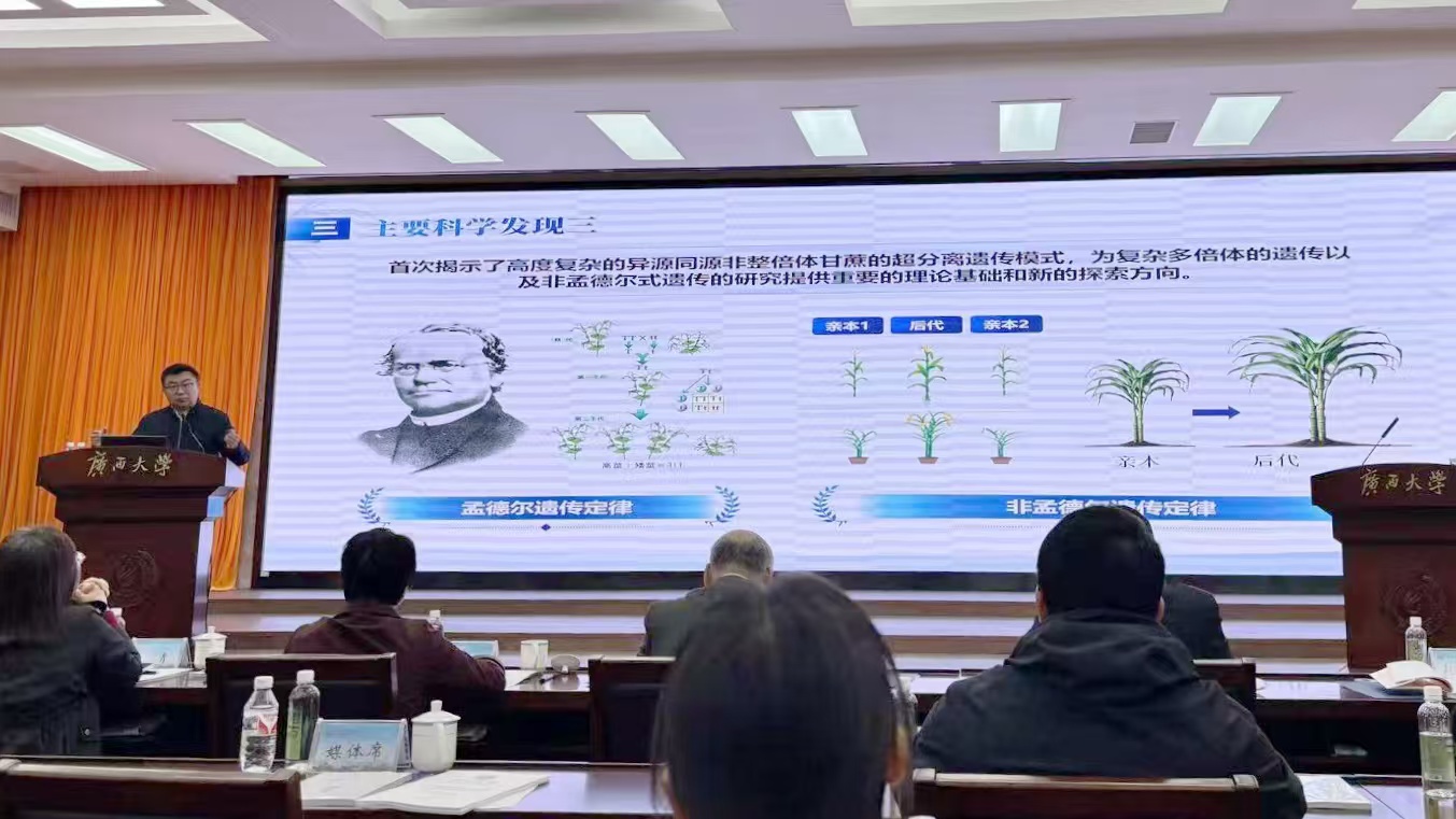 刘耀光院士表示,虽然我国甘蔗全基因组研究于2010年前后才开展,但在国际上研究进展最快。其中,新葡的京集团8814检测站亚热带农业生物资源保护与利用国家重点实验室张积森研究团队于2018年解析了首个完整的同源多倍体甘蔗割手密种(野生种)基因组,这一里程碑式的工作标志着甘蔗基因组研究进入了新时代。随后该团队在2022年,系统阐明了甘蔗割手密种的种质资源演化、2023年又解析了完整甘蔗复合体基因组,为超复杂的异源同源非整倍体的现代栽培甘蔗研究奠定了重要的基础。近期,张积森研究团队在《自然遗传学》上发表题为《现代栽培甘蔗的高倍体复杂基因组与近期异源多倍演化》的研究论文,解析了现代栽培种甘蔗新台糖22号基因组,多倍体遗传位点定位的成功实践是该领域的重要突破。该测序的品种(新台糖22号)是我国第三代主栽品种(种植面积曾达到85%以上),也是目前第四代主栽品种培育过程中的最重要的亲本。张积森团队在甘蔗复杂多倍体基因组及其遗传研究的原创性、系统性工作,开创了栽培甘蔗生物学研究的新篇章。