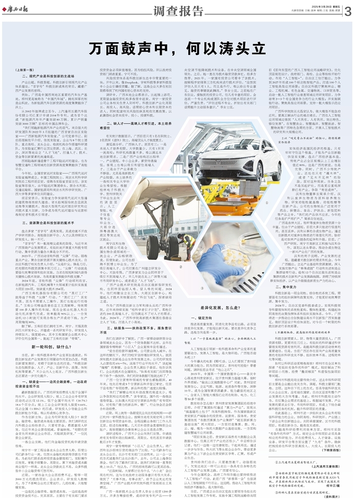 当前,八桂大地上,新能源汽车、新材料、新能源等新产业、新业态加速崛起;与此同时,创新生态、成果转化、要素集聚等环节的现实瓶颈也愈发凸显。如何抓住新一轮科技革命和产业变革机遇?如何将区位优势转化为创新胜势?广西云-广西日报调研组深入区内外产学研一线,探究创新链与产业链无缝对接之道,解锁“实验室”到“生产线”的转化密码。