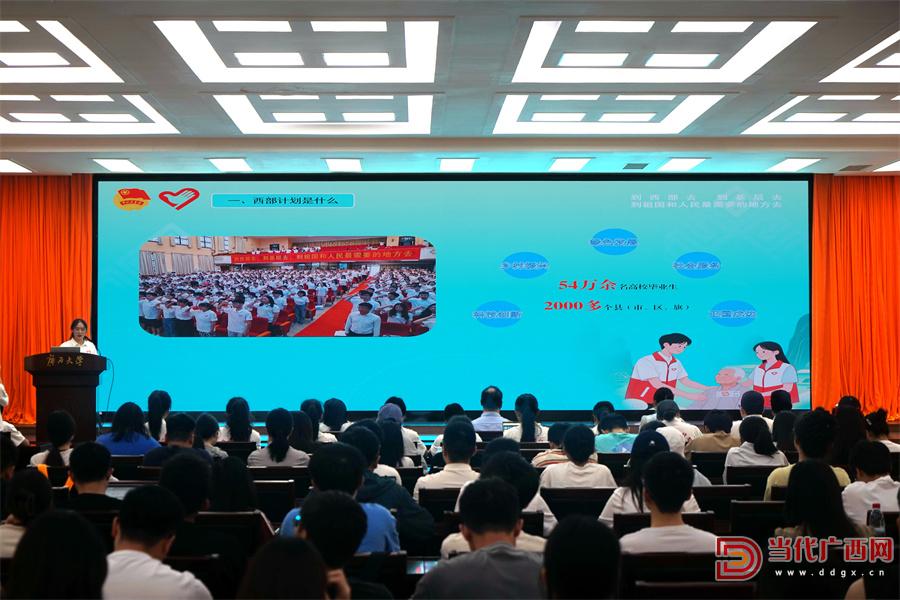 宣讲会上,西部计划广西项目办围绕西部计划是什么、为什么选择西部计划、如何报名西部计划、参加西部计划可享受哪些政策保障等方面进行政策解读。黄艳琴、罗智文、罗海芳、许敏等4名优秀西部计划志愿者代表分别结合服务岗位,分享了参与西部计划的心路历程、实践故事和成长收获,并向大家发出“赴西部之约”的邀请。