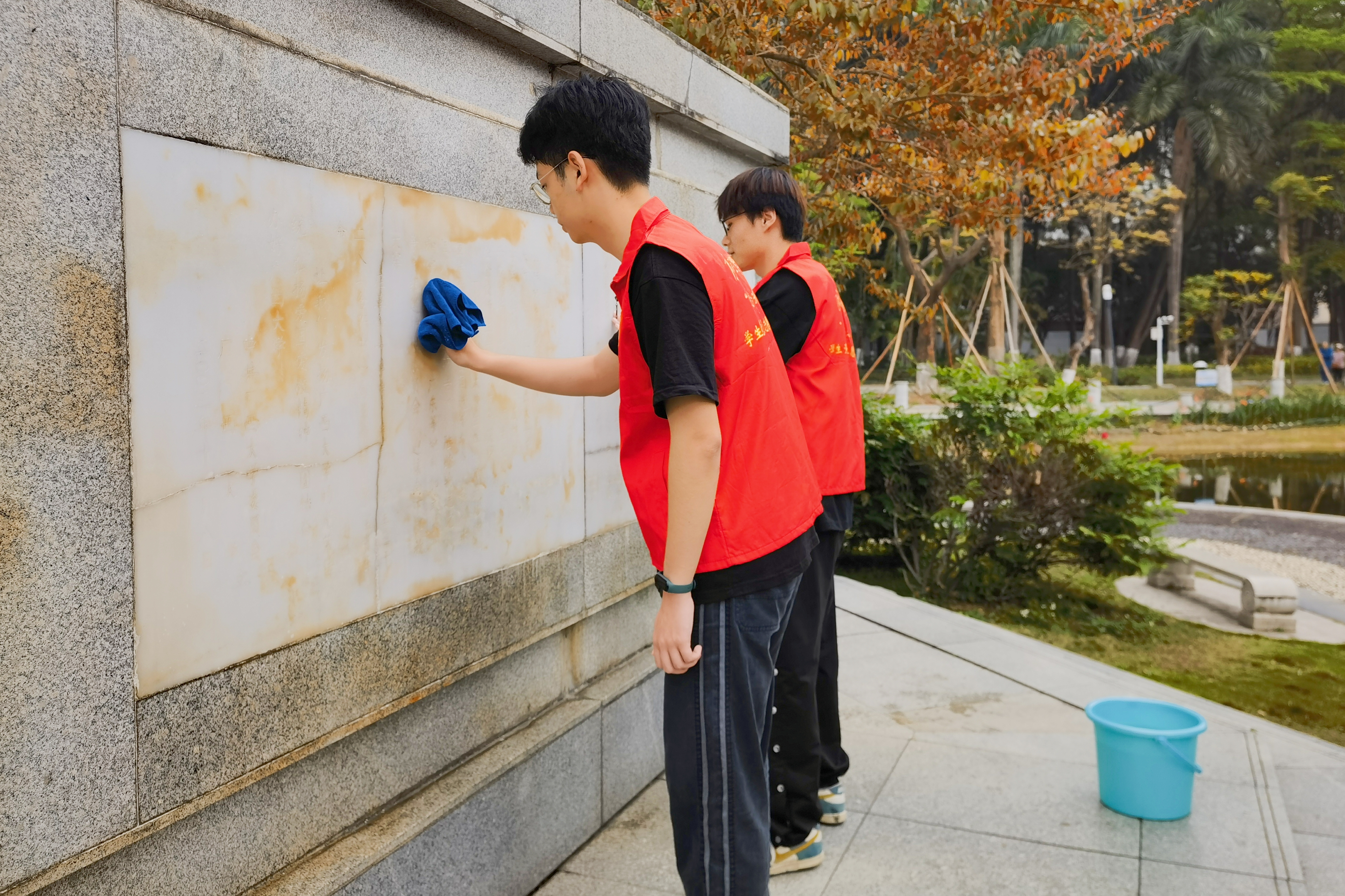 经过时间沉淀和风雨剥蚀,纪念碑的碑文已然褪色。师生们怀着敬仰之情仔细擦拭碑体上的微尘,认真用画笔为碑文描摹填漆。描红一笔,更多一分缅怀;描红一画,更增一分敬意。