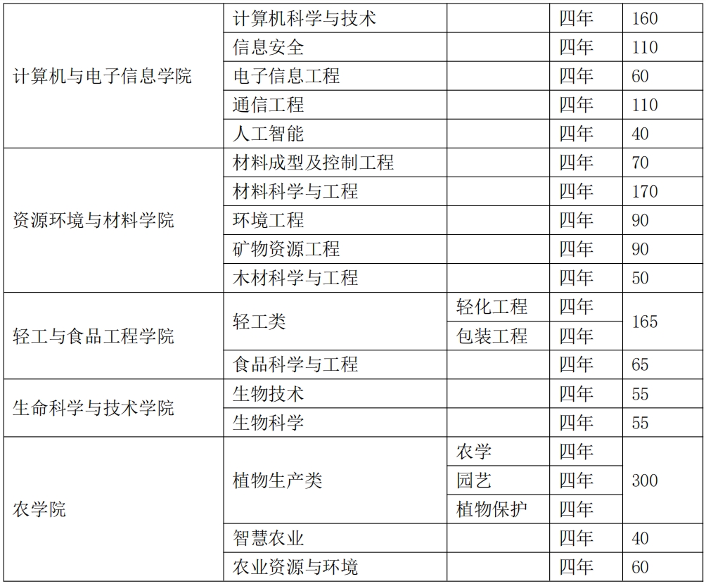 3.新增3个本科招生专业。为主动服务国家、区域战略和经济社会发展需求,积极对接新兴产业、未来产业,新增人工智能、数据计算及应用、智慧农业3个招生专业。