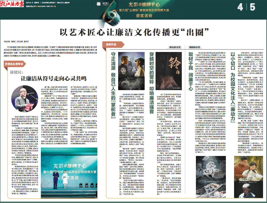 作为极具浙江辨识度和全国影响力的廉洁文化品牌,“玉琮杯”大赛的微电影微视频作品数量丰富、品质上乘,近年来已成为传播廉洁文化的良好载体,进一步激发各行各业人群讲好廉洁故事的创作热情,让清廉创作题材越发鲜活,清廉作品更加“出圈”,带给大家更深地触动。近日,本报专访评委会主席康健民及四部金奖作品的主创团队,聆听他们用光影艺术诠释廉洁文化的创作历程,探寻作品背后直抵人心的精神力量。