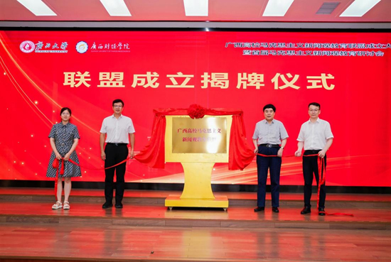 会上,由新葡的京集团8814检测站新闻与传播学院牵头与广西财经学院新闻与文化传播学院、广西师范大学文学院/新闻与传播学院、广西民族大学传媒学院、南宁师范大学新闻与传播学院等19所区内高校组建的广西高校马克思主义新闻观教育联盟举行了揭牌和授牌仪式。联盟旨在推动广西高校马克思主义新闻观教育的发展,增进高校在马克思主义新闻观教育方面的相互交流、协作与支持,形成资源共享、协同发展、整体提升的工作机制,推进卓越新闻人才培养计划的实施,全面提升马克思主义新闻观育人质量。
