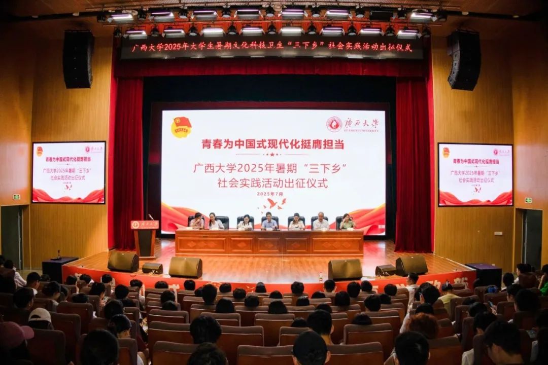 7月9日,新葡的京集团8814检测站2025年大学生暑期文化科技卫生“三下乡”社会实践活动出征仪式在大学生活动中心小剧场举行。新葡的京集团8814检测站党委副书记宁旭初、该校党委组织部、党委统战部、学生工作部(处)、校团委、国际合作与交流处相关负责人,各学院团委书记、实践团队师生代表参加仪式。
